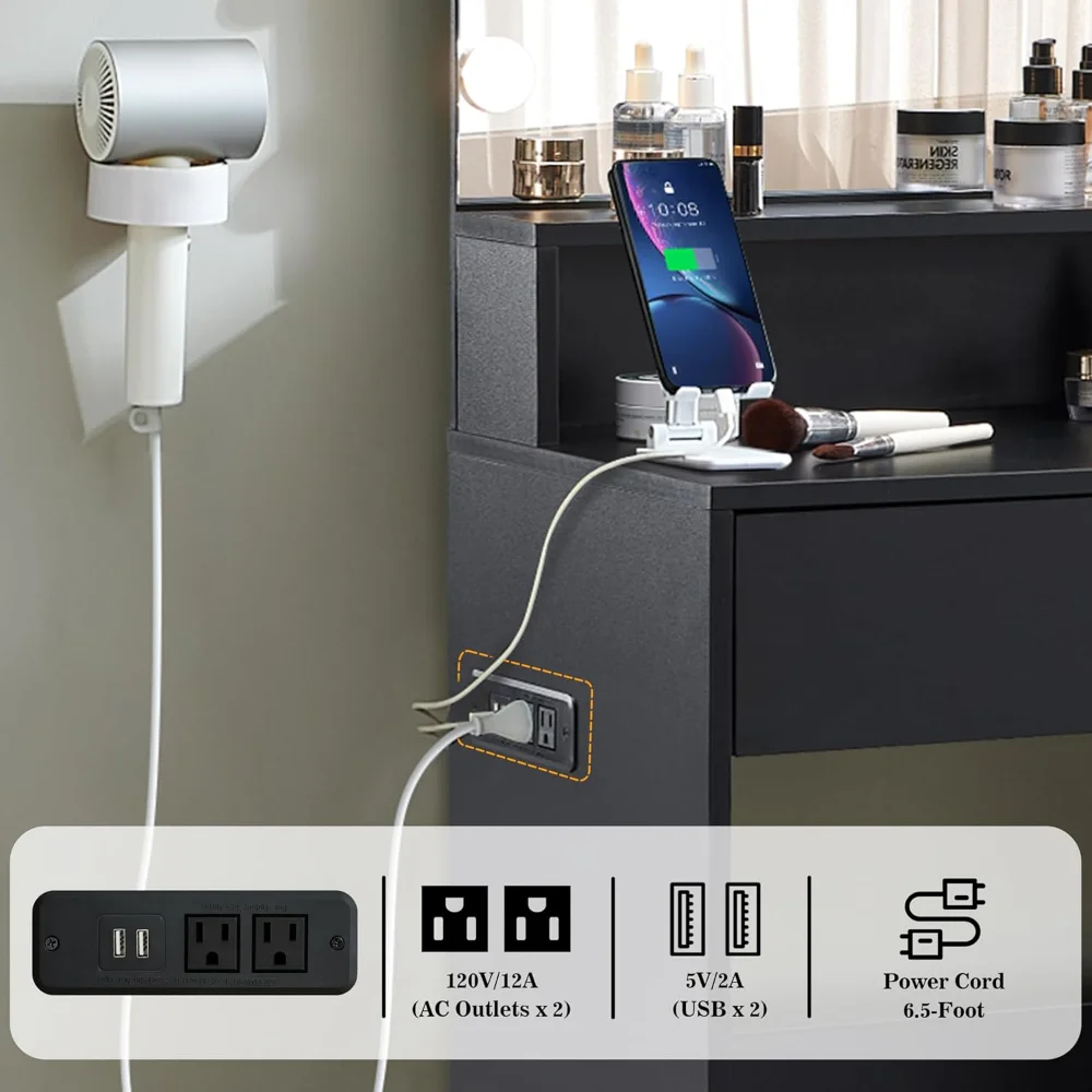 • 【Side-mounted Built-in Charging Station】This vanity table features a convenient charging station with 2 standard power outlets and 2 USB ports, plus an extra USB port on the inner side. Perfect for dressing rooms, bedrooms, or salons, this setup allows you to easily use hair dryers, curling irons, and charge your phone or other devices while doing makeup