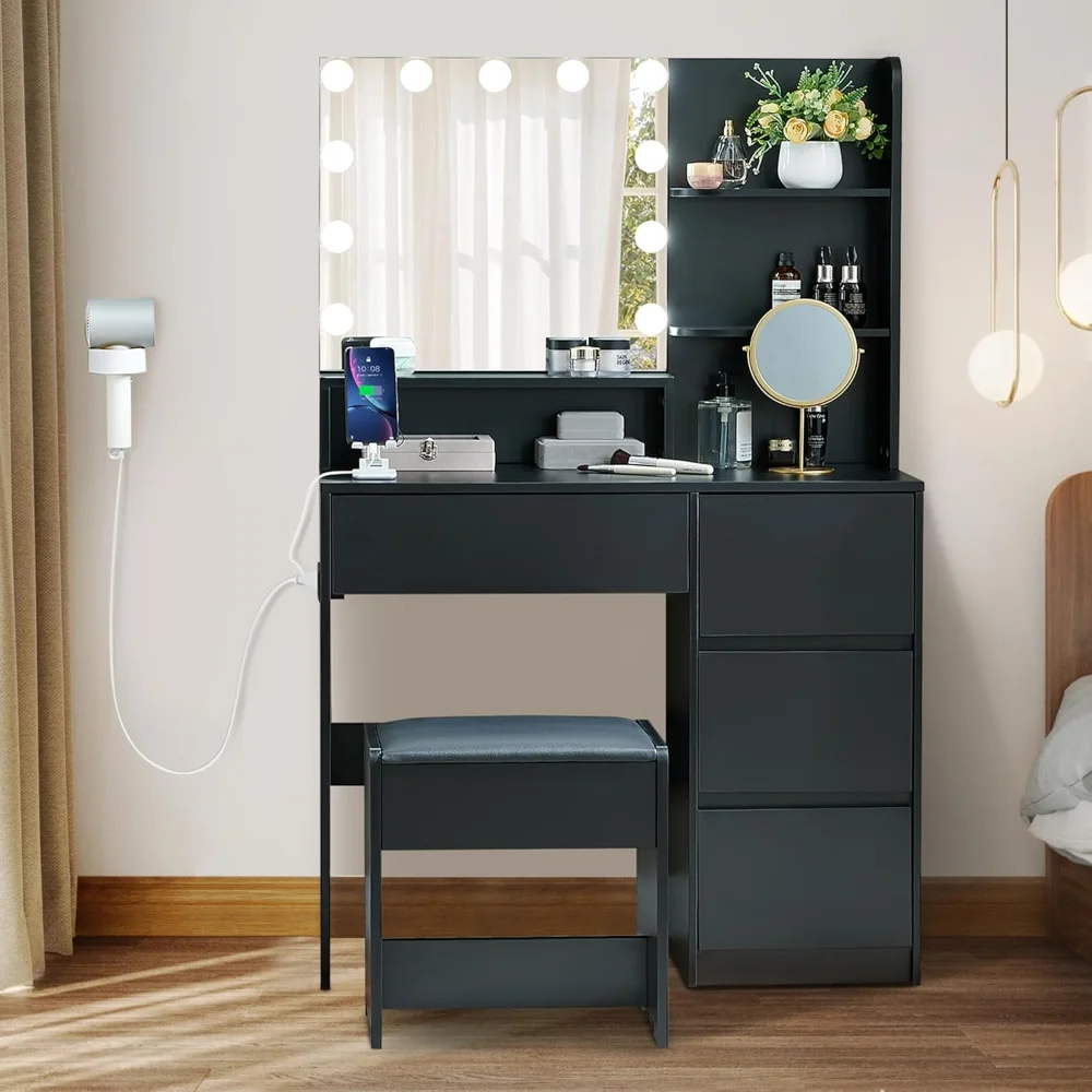 Black Vanity Desk with Mirror and Lights- Makeup Vanity Table Set with Power Outlet, 4 Drawers and Stool, Small Makeup Table